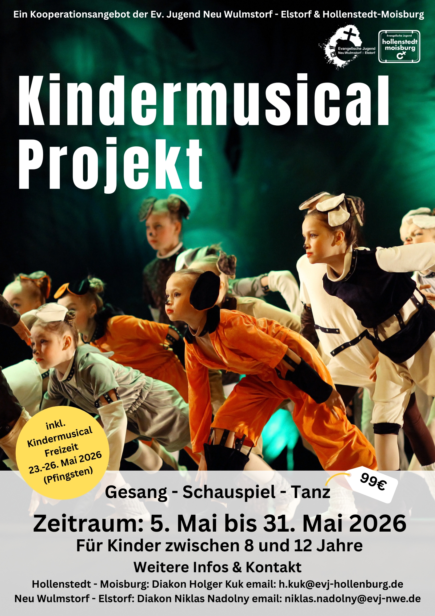 Im Kindermusical-Projekt wird mit Kindern im Alter von 8 bis 12 Jahren ein christliches Musical mit Gesang und Schauspiel entwickelt, geprobt und aufgeführt. Hierbei werden die Kinder in sämtliche Entwicklungsprozesse eingebunden. Von der Themenfindung, über die inhaltliche Ausarbeitung bis hin zur Gestaltung der Bühnenbilder, Requisiten, dem Gesang und dem Theaterschauspiel. Das Musical ist in mehrere Phasen aufgeteilt: Zu Beginn zwei Projekttage, anschließend ein verlängertes Freizeitwochende über Pfingsten. Enden wir das Projekt mit zwei Aufführungen in den Kirchengemeinden Hollenstedt und Neu Wulmstorf