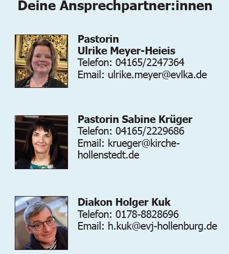 Wenn ihr eine Frage habt, die hier nicht direkt beantwortet wird, wendet Euch bitte an die beiden Pastorinnen und/oder den Diakon: